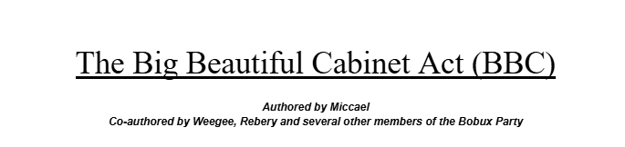 The Big Beautiful Cabinet Act (BBC) was posted yesterday by bobux member miccael to reform the Ministers and their Ministries.